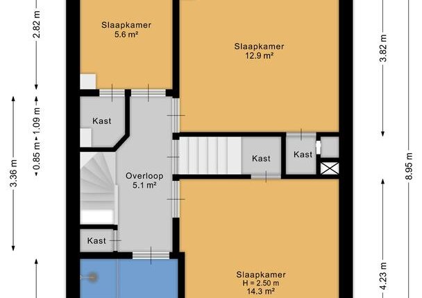 Overloop met inbouwkast, drie slaapkamers van circa 6, 13 en 14 m², allen voorzien van vaste kastruimte en de grootste heeft openslaande deuren naar het balkon. Badkamer met douche en wastafel. Vaste trap naar de ...