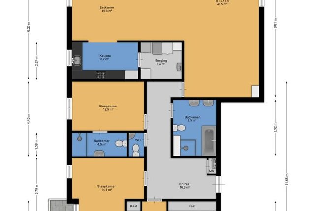 U komt het appartement binnen via de ruime hal, waar zich de meterkast en het gastentoilet bevinden. Vanuit hier heeft u toegang tot de royale living met open keuken (75 m²), bijkeuken met aansluitingen voor witgoed en een heerlijk zonneterras aan de voorzijde (15 m²).