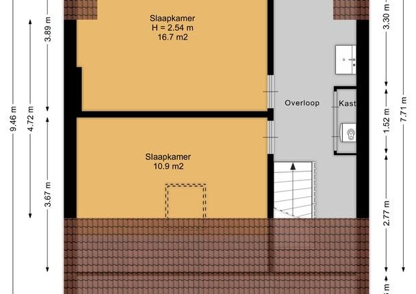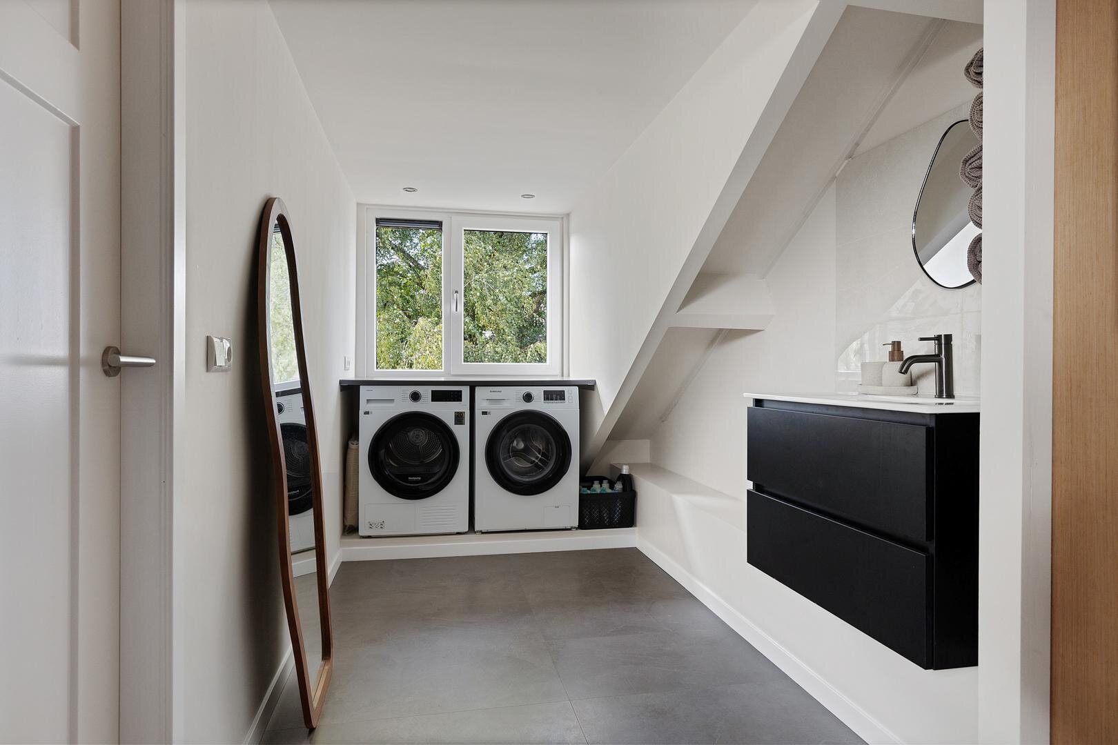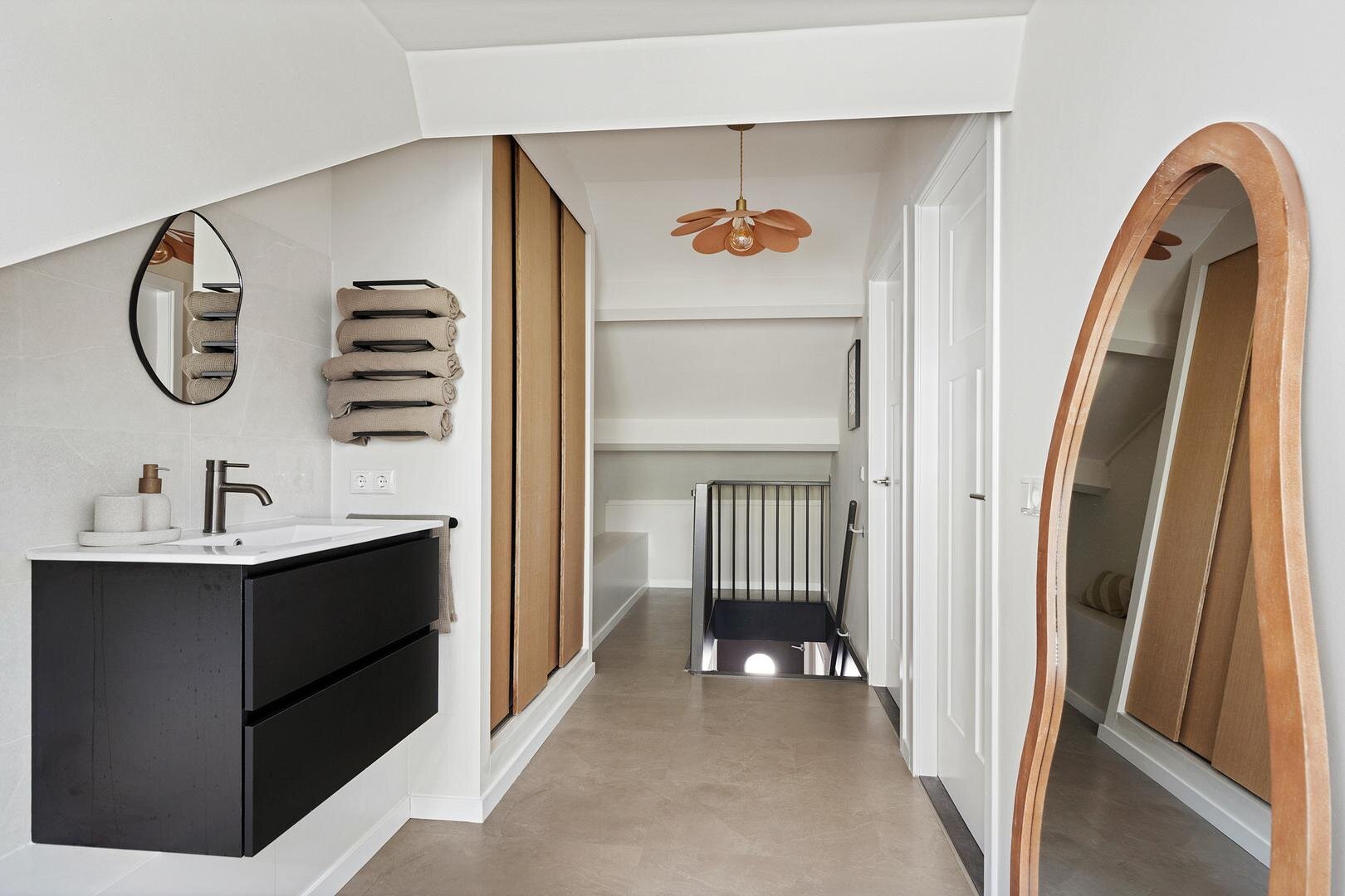 2e verdieping: zeer ruime overloop met witgoedaansluitingen en een wastafel, 2 slaapkamers (ca. 11 en 17 m2). Op de overloop is eventueel een 2e badkamer te realiseren!