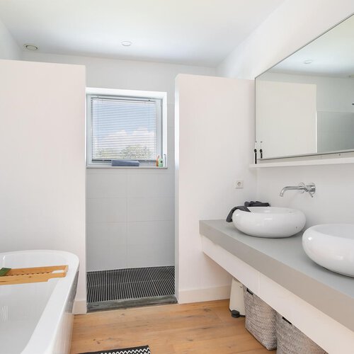 Vanuit de hal zijn de slaapkamers en badkamers bereikbaar. De slaapkamers zijn mooi ruim van afmeting (13, 14 & 22 m²). 2 slaapkamers hebben toegang tot een 2e zonneterras (13 m²) aan de achterzijde. De badkamer is toegankelijk vanuit de hal. Deze is voorzien van een complete inrichting met ligbad, douchecabine, 2 wastafels en een toilet. De gastenbadkamer is bereikbaar vanuit een slaapkamer en voorzien van een inloopdouche, wastafel en toilet.